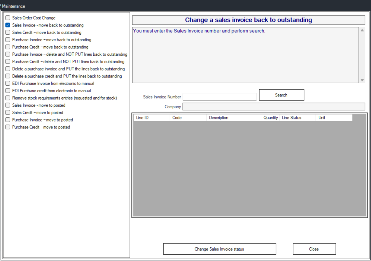 Prima > Settings > Maintenance > Sales Invoice - Move back to outstanding