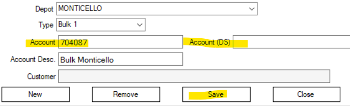 - If the account already exists, highlight and edit the correct account # in the Account field, this will be the default for Wrap & Pack and Drop ship. If there is a specified account # for Drop ship enter that account # in the Account (DS) field. Save.