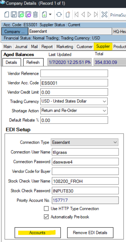 - Go to the Supplier tab and click “Accounts” (under EDI Setup)