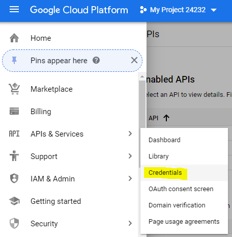 - Click into APIs & Services ► Credentials using the menu on the left of the page.