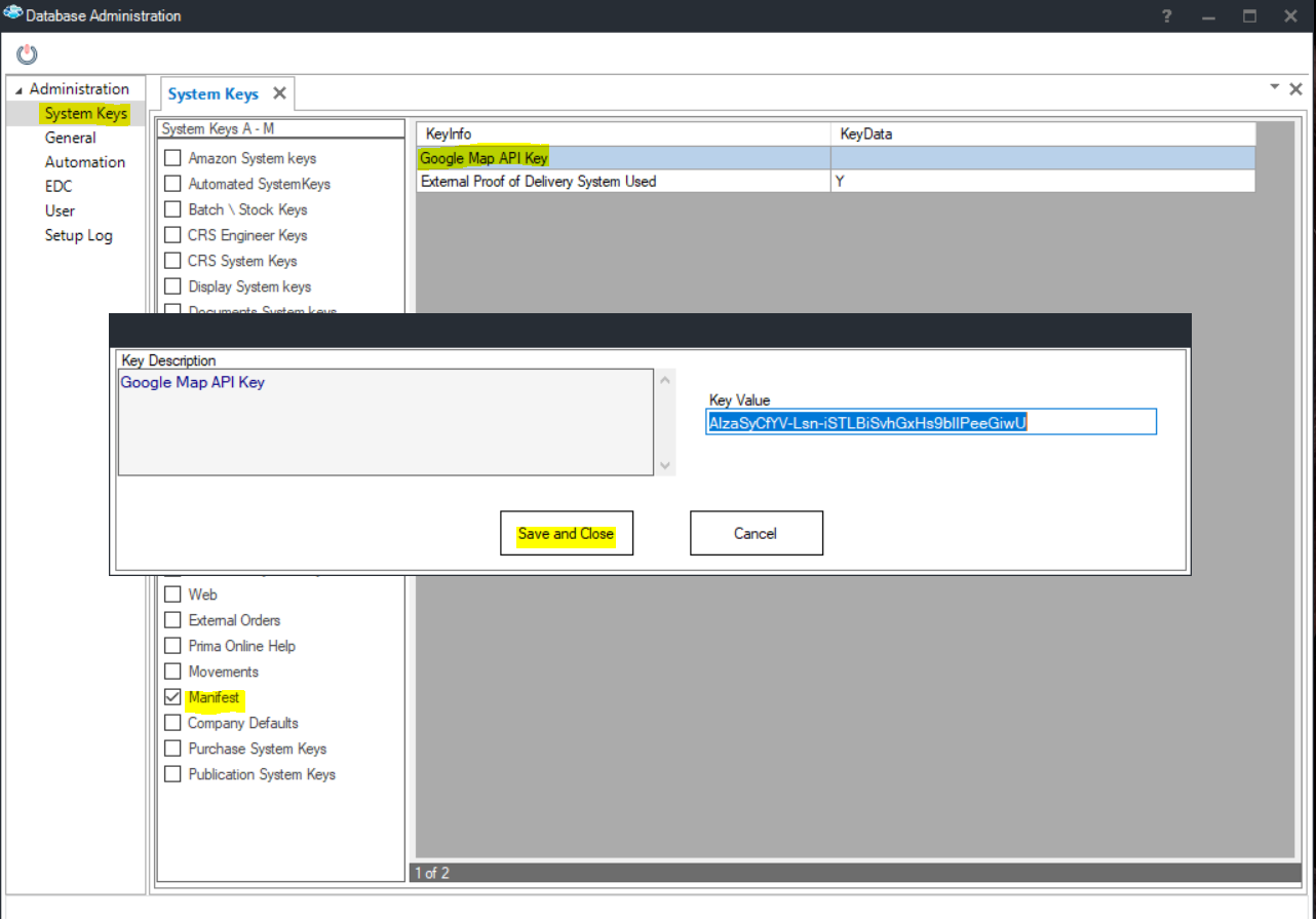 - Navigate to System Keys ► Manifest ► Google Map API key.