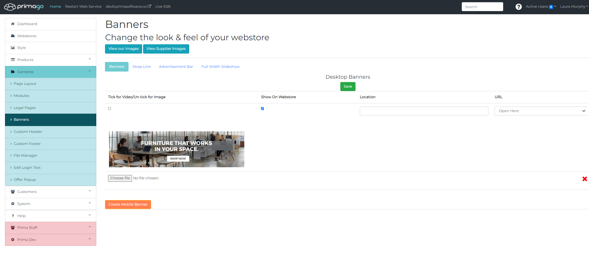 Banners are a great way to draw attention to the main page of your webstore. To access Banners, Open the Prima Go Control Panel on the far left, then selecting Contents > Banners.