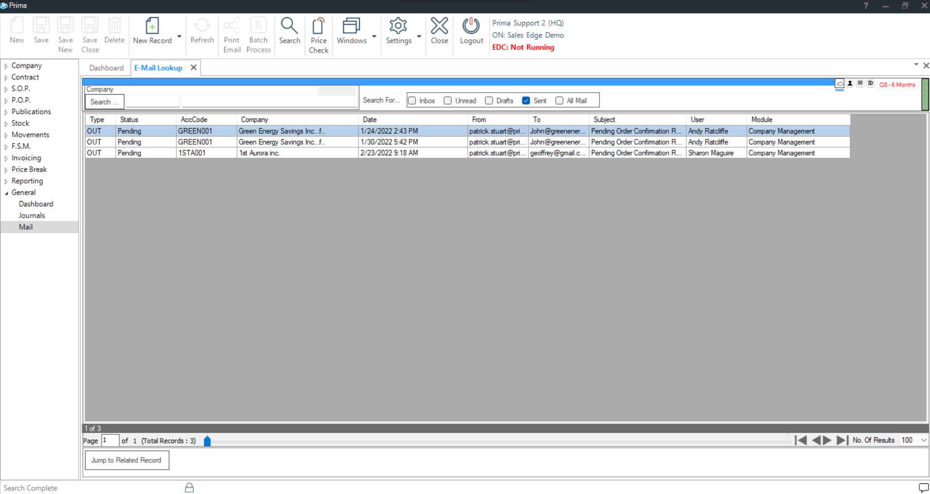 If you have an Authoriser who's is not receiving emails to approve orders, firstly check in Prima > Company > Contacts that the correct authoriser is setup for the contact that has created the order. if the correct authoriser is set up them make sure they have the correct email set up. You can also view the email that was sent to the authoriser in Prima > General >Mail > Blue bar > Add %Pending into the Subject > Search.