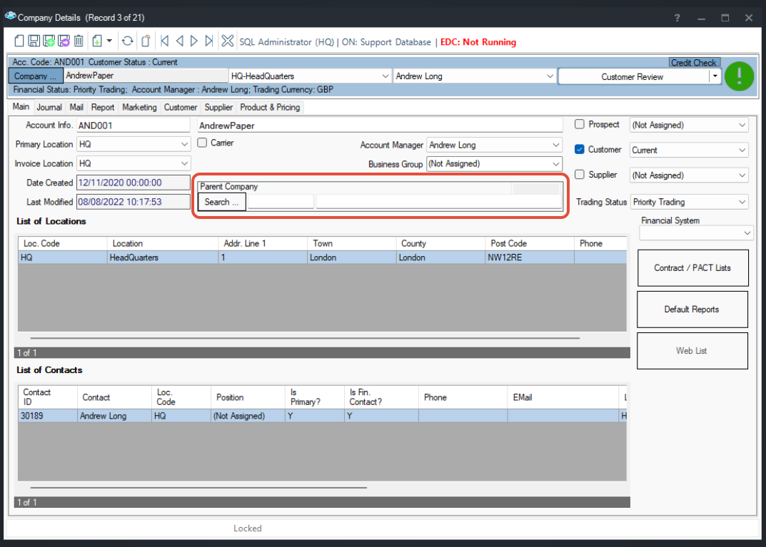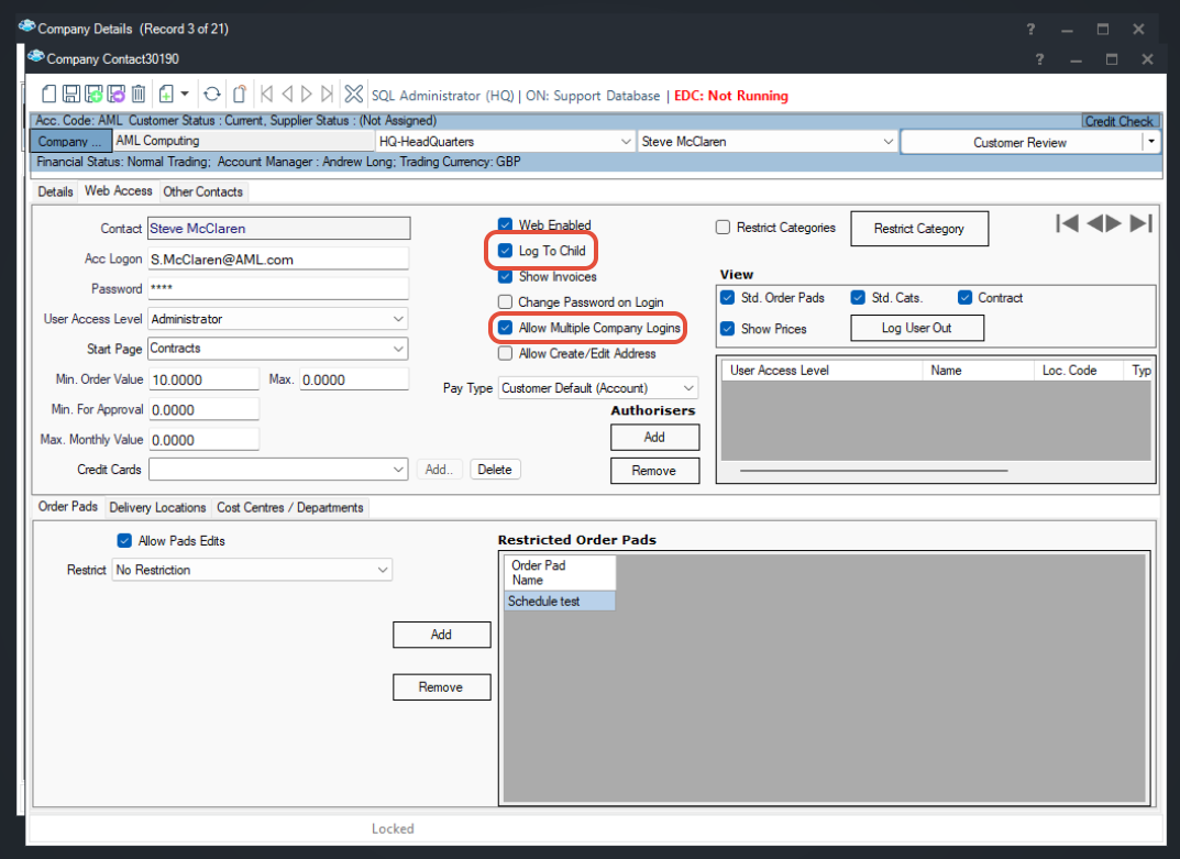 This is beneficial where a parent company user may need to access child accounts for ordering/approval processes, as well as reviewing the order history on specific linked companies.
