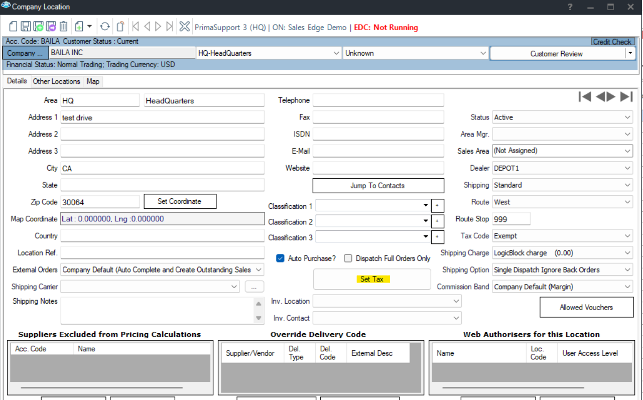 You can set the tax code of an individual location to be Exempt or to another tax rate in the location Tax Code drop down (add more rates in Admin>General>Tax)