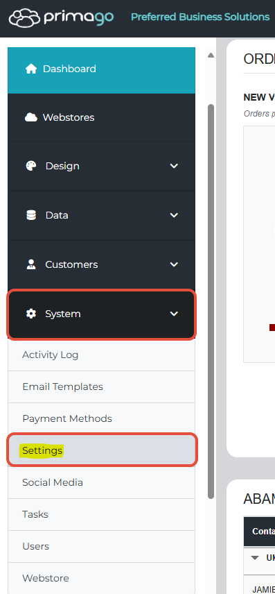 To enable reoccurring orders for your customers, go to the PrimaGO control panel, click the "System" drop-down menu, and then "Settings".