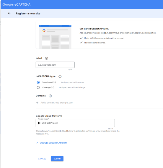 Upon clicking on Register Here you should be taken to the following page, where you will need to give it a label (doesn’t matter what this is but for ease put the domain) then in the domain section add in the web store domain and finally in the project put something like Webstore Captcha. Please make sure the V3 captcha option is selected and then when you then submit it should give you an API key, to put into the webstore control panel.