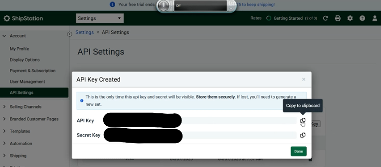2. Login to ShipStation to get API keys from Settings>Account>API Settings>Generate API Key (note: you have to verify your email first)