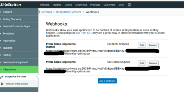 Clicking on the symbol marked above with a tick shows the webhooks, create 2 webhooks called "Prima On Items Shipped" and "Prima On Orders Shipped" and register with our ShipStation account by pasting in the Prima REST API as follows: